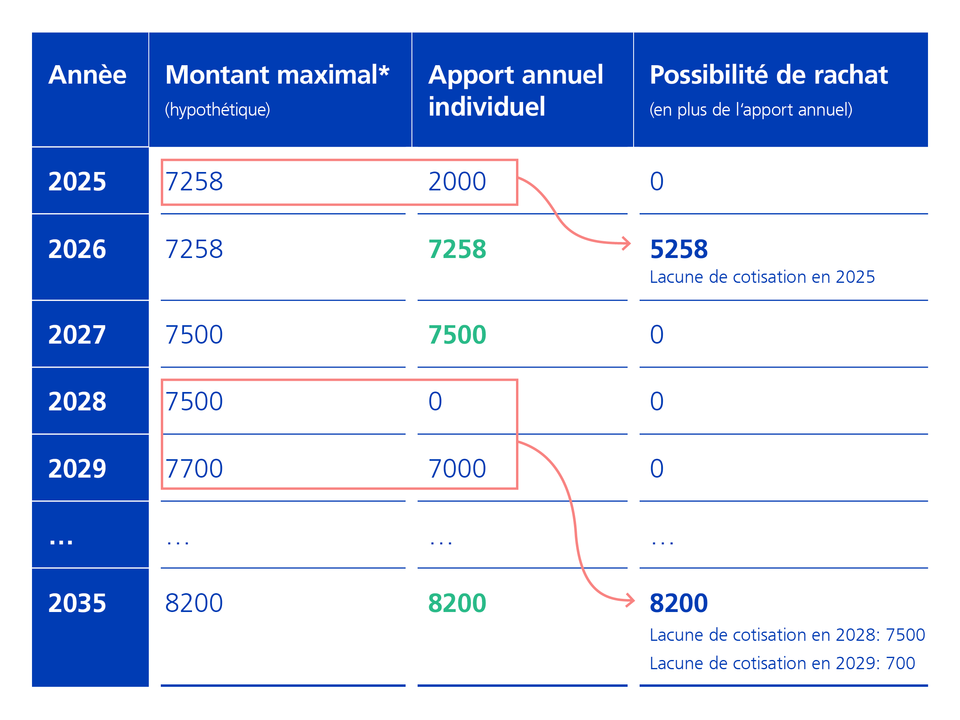 En 2035, vous avez de nouveau atteint le montant maximal. Il est donc possible de combler ultérieurement les lacunes de cotisation des années 2028 et 2029. Si, au cours d’une année, vous effectuez des rachats pour plusieurs lacunes annuelles, le montant cumulé des rachats ne peut pas excéder le petit montant maximal de l’année en cours.